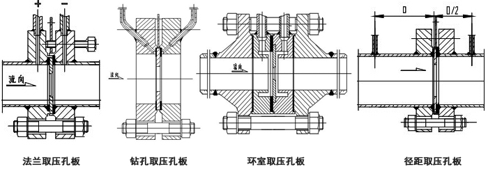属标准孔板。取压方式为管道取压。上游取压孔中心位于孔板前面一倍管道内径处。下游取压孔中心位于距离孔板后端面为管内径之半的地方。